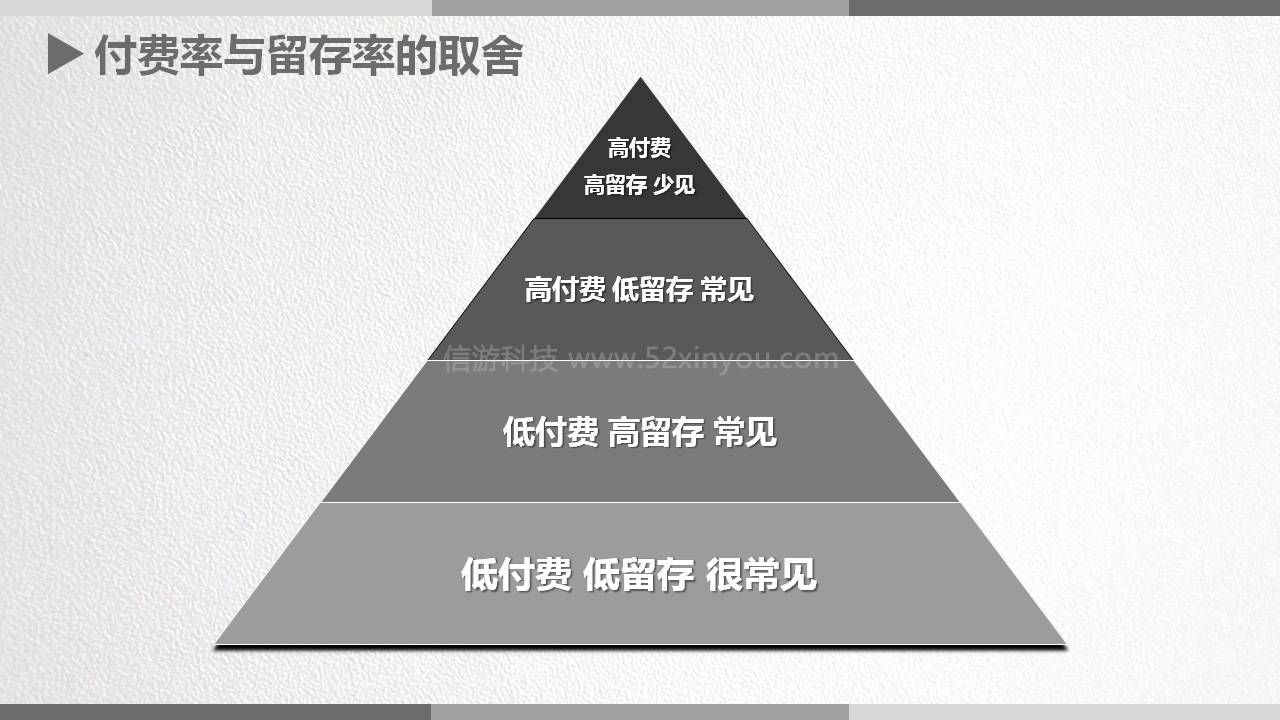 刚刚做团队时要追求留存率,等经营到一定程度,有一定人气时我们会追求付费率,最终都是为了赚钱嘛。高付费高留存这是金字塔顶端的游戏类型,所有的研发商运营商都想做出这样的游戏,但是这样的游戏非常非常少见,其次追求高付费低留存,这种游戏很常见,尤其传奇类的游戏典型代表,你不充钱玩不下去,比如你充10万可以闭着眼碾压充1万的人,咱们也讲过付费率高的情况留存率势必会低。还有低付费高留存的游戏也很多,像SLG策略类游戏,比如说各种三国游戏,这种游戏付费率低,但是用户粘着率高,刚开始看不出来,但是之后他就会很平稳,等你做到这行业之后,你观察你代理的这种游戏,你会发现这个曲线就是第二日的留存非常非常得低,但是三日、四日、五日之后的留存就非常高了。还有就是低付费,低留存的游戏,非常非常多,市场上80%的游戏都是这样的,这也就是经常给大家说的同质化的原因,就是一些换皮游戏,不去创新,从来不考虑的游戏的平衡和数据,也不是他不愿意去考虑,只是小团队他没有能力也没有人员来做这些,他就搞个源码换个皮就上线,赚不赚钱就靠运营了,这种游戏很常见。