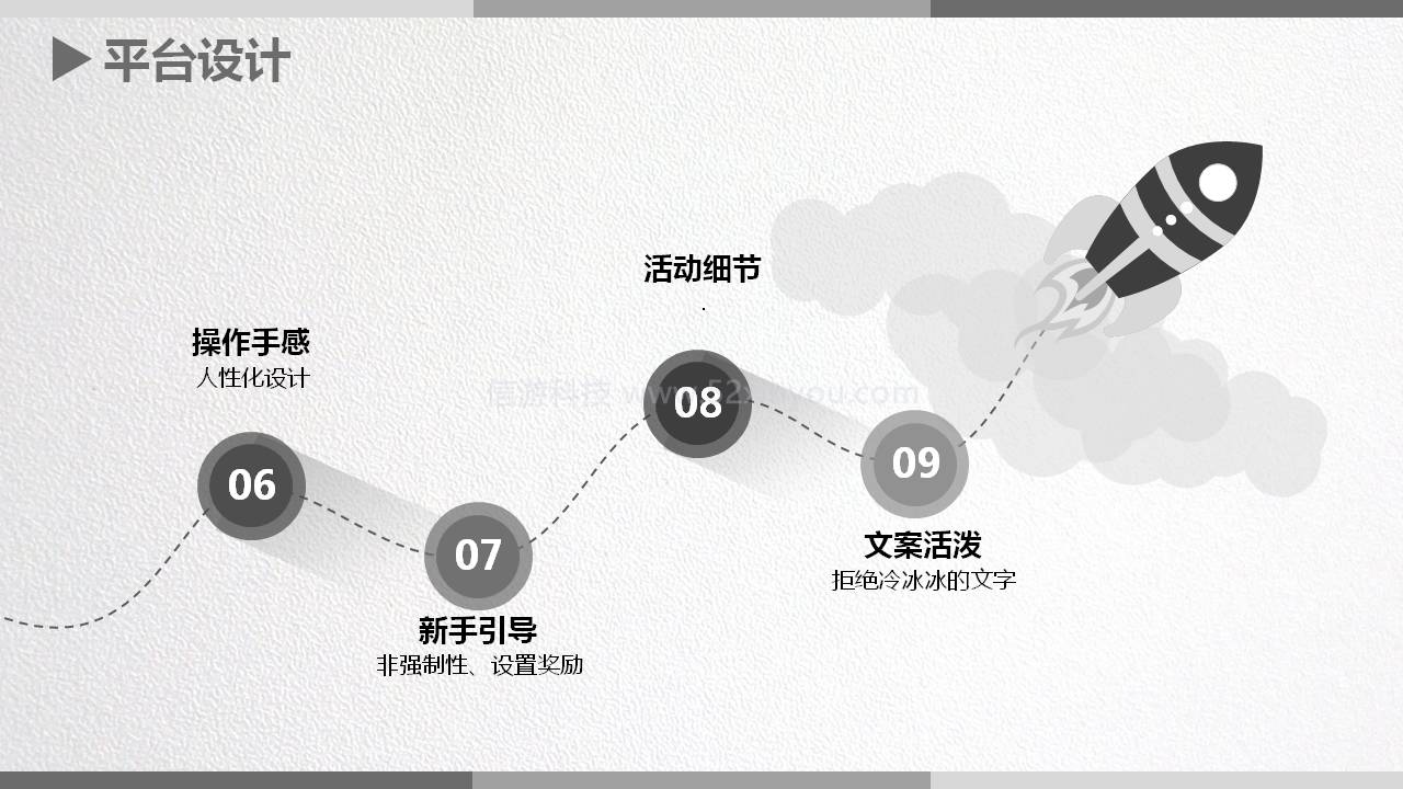 新手引导:游戏中见得比较多,咱们平台上也需要新手的引导。引导要注意,第一点是非强制性,千万不要强制玩家做这个操作,除非法律有规定必须要实名制,像防沉迷的实名认证,我们要强制玩家去做。第二点奖励,比如填写了个人信息给你奖励积分装备服务等级等,一定要有奖励的非强制性的去引导玩家。
