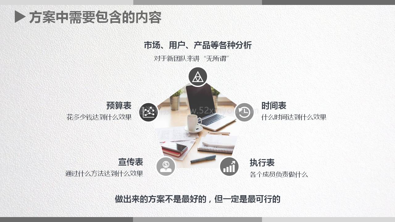 市场、用户、产品等各种分析,这些对于新团队来讲“无所谓”。首先你不一定会分析,其次分析了也没多大意义,这些一般大的集团、大的公司会讲这一套,如果是小团队新团队这些并不是方案里最重要的环节,并不是真的无所谓只是说占的比重轻一些。